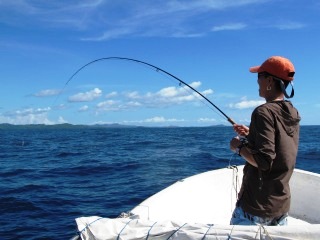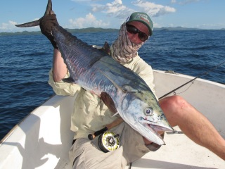 I thought I was done fly fishing for the day when I saw what I thought was a barracuda explode from a distant tuna school. George saw it too and the boat sped up towards that direction. Again a long narrow bodied fish scattered all kinds of baitfish. It was still too far to identify the species but then it sky rocketed (I’m not kidding) 12 feet in the air! It was the unique specie of king mackerel only found in the Indian Ocean and the very western part of the Pacific Ocean.