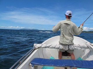 Our fishing began with a school of charging bonito. George spotted them and with excitement shouted get ready. I grabbed my 8-weight Ross rigged with a Scientific Anglers Tropic Express 250 grain line and started stripping it off the reel. Bait was scattering everywhere and when we got close George cut the engines and we coasted in to the action. I launched off several casts and stripped at the speed of lightning but got nothing. We did this several times without success before George insisted we continue north for bigger fish.
