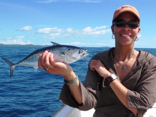 For those of you that know me, breaking me wasn’t an option, so although I was in some ways going through the motions, I kept on going. Sure enough, we got close enough to a school of skipjack tuna and I got one. Then another. And another and before I knew it I landed eight skipjack tuna. Soon Granny realized fishing was worth it so I handed her the rod and she caught a few while I took my first rest of the day.