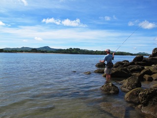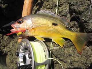 home and Granny can work some overtime. I reluctantly gave George $600 up front. I hate doing that in foreign country but I can’t blame him for wanting it. He needs to organize his boat, get fuel etc. We are scheduled to meet him at 7:30 AM tomorrow. He says he’s seen a fly rod and he has a plan. I’ve heard that before so Granny and I are just mentally prepared for an adventure. We spent the rest of our day fishing the rocks while the tide rolled back in. I stuck to the same rig and while Granny checked out the cool crabs and shells of the tide pools I landed one more new species. It was a mono fish, nothing spectacular but a new one. We also played with a squid that attacked my fly every time I cast. Then catching me by surprise, a decent sized grouper nailed my Clouser and escaped by tangling me in the coral. That led to my first swim of the trip to retrieve my fly line. The last thing I need is to lose a fly line on the first day. After fishing we chilled out on our room porch with a tall cold beer. Then we headed back up to the main porch. Granny was walking a good distance ahead and laughed when she noticed the camp help put a fake snake on our walk. I thought it was pretty funny too. You can’t scare the Americans we thought. But then the snake moved. It was a 6 foot long tree boa that started slithering along with us as if he too was headed for dinner. Granny and I don’t mind even big snakes. We have neat snake stories from previous travels in Africa that prepared us for life with snakes. Our first reaction now is to keep it quiet as you never know how the camp help will react. We don’t want them to see the snake